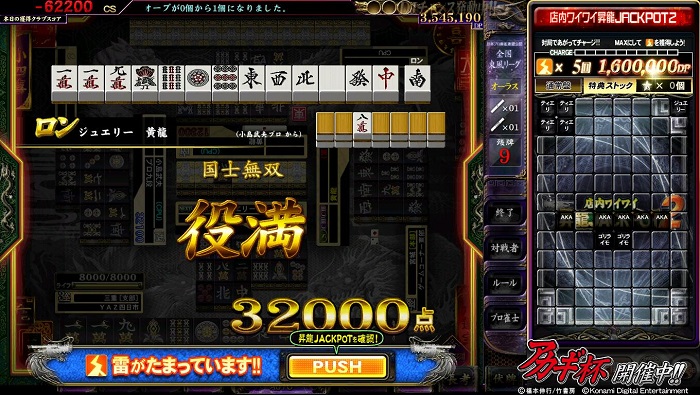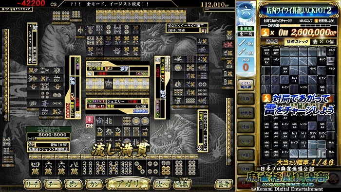 流局した時点で自分の捨て牌が1、9、字牌のみで構成されており、 なおかつその牌が他家から鳴かれていなかった場合につく役です。 自動的に満貫扱いとなります。 |